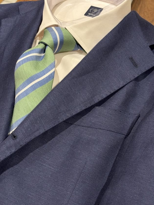 スーツなので勿論タイドアップでのスタイリングもお楽しみ頂けます。今回はリネン/シルク生地のネクタイを合わせました。