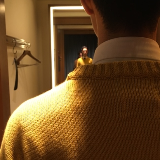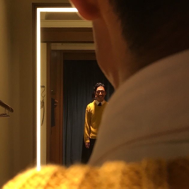 鏡越しでもニッコニコのしめちゃん。
