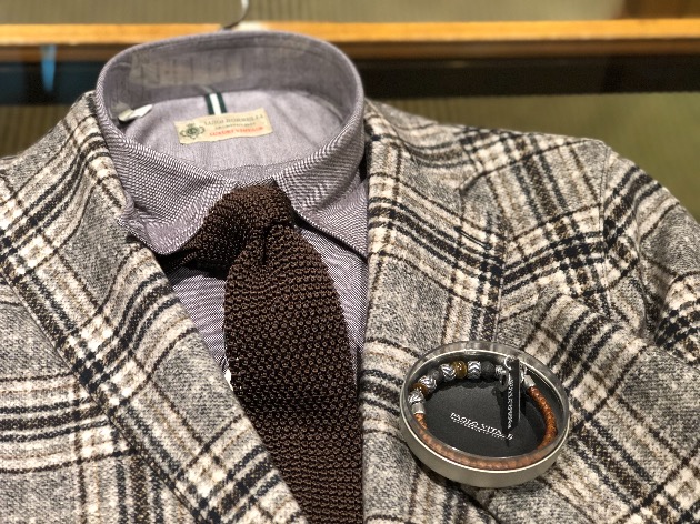 グレンプレイドのジャージージャケットにネッカチーフを合わせた軽快なスタイルにグレーのビーズブレスレットを。