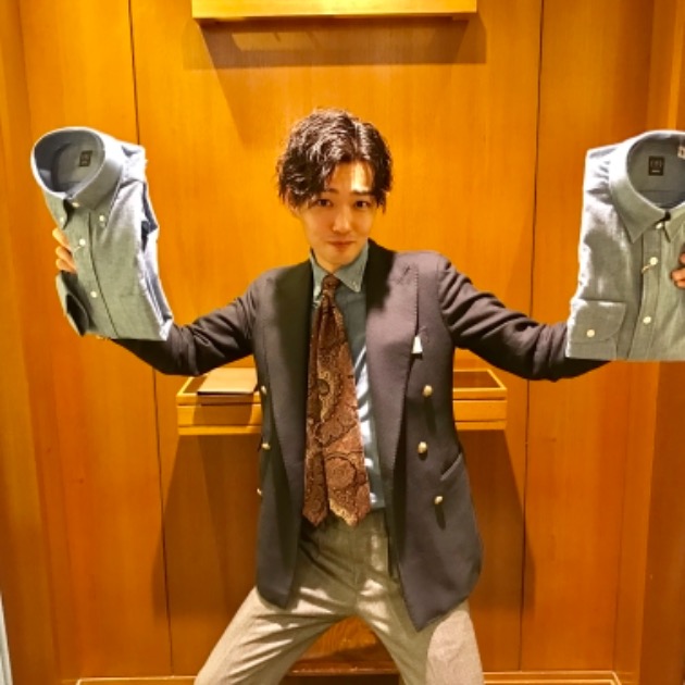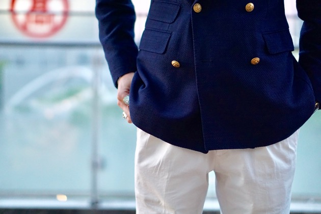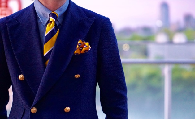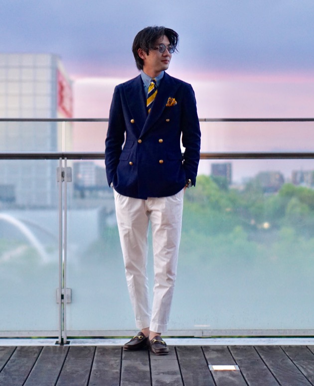 ダブルのブレザーにネクタイ、チーフはトレンドカラーのイエローでまとめました。
