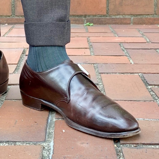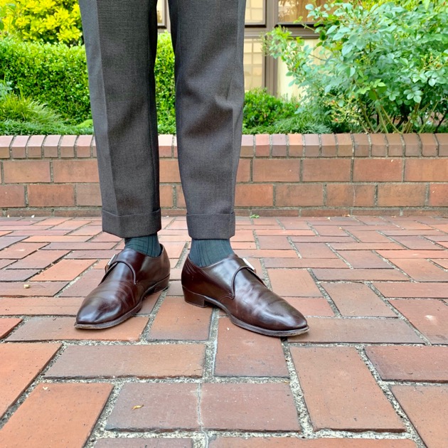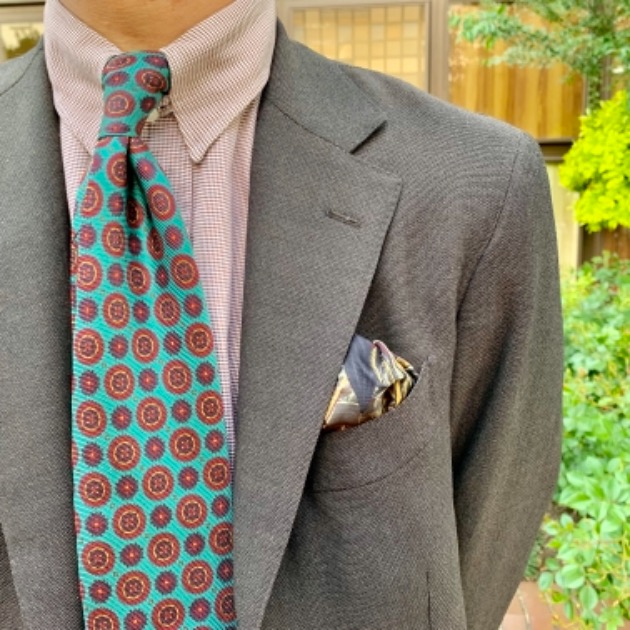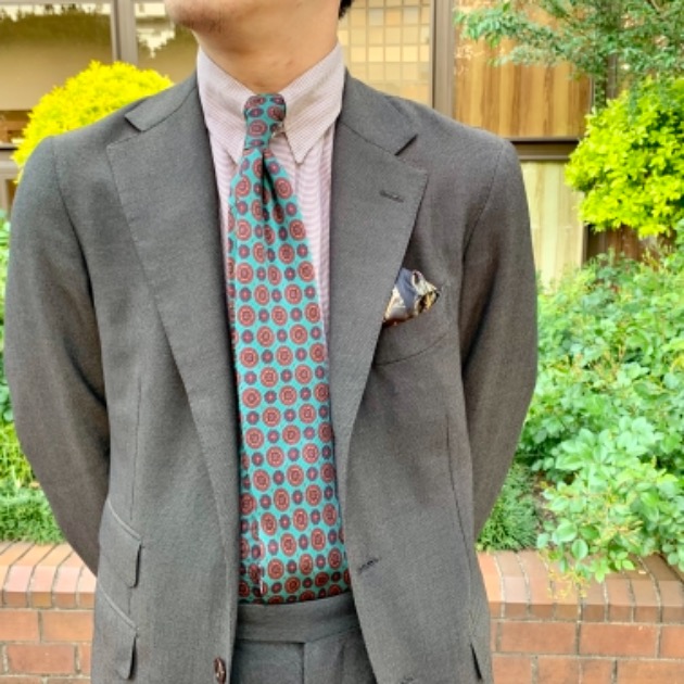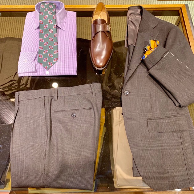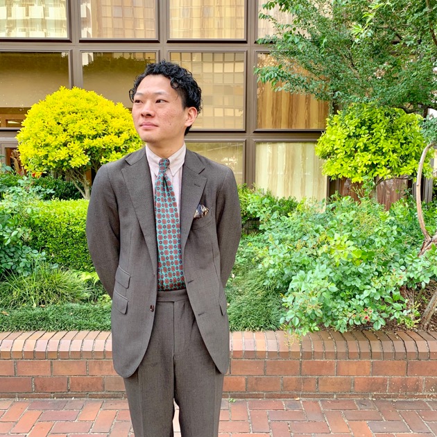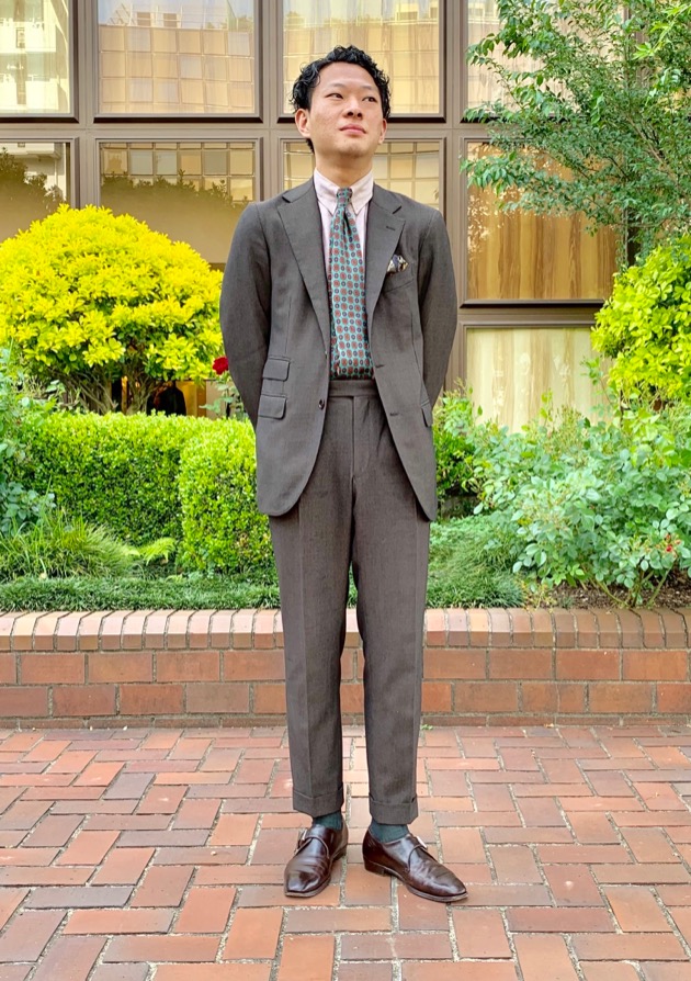スーツはチャコールグレイにも見えますが、今期大注目カラーのブラウンです。