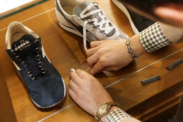 大人が履けるスニーカー。ストーンウォッシュのアタリが良い味出しています。