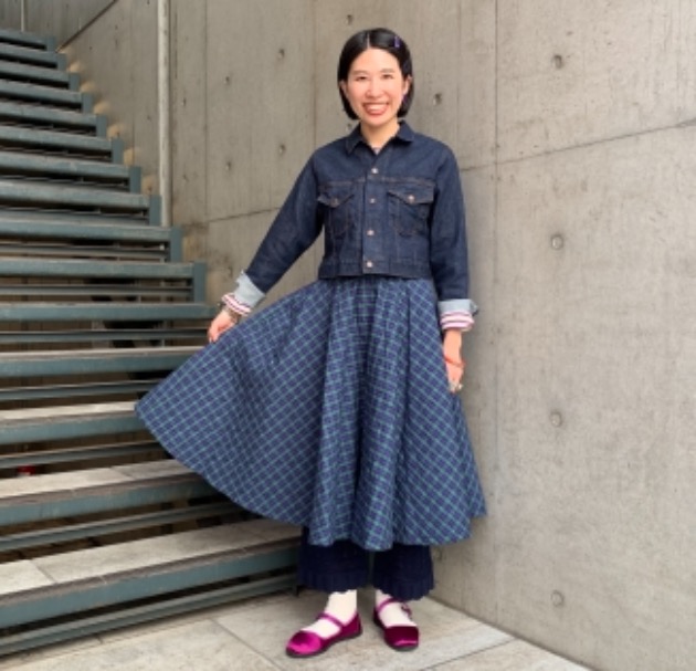 スカートのボリュームを活かして、コンパクトなデニムジャケットを合わせてバランスをとりました。