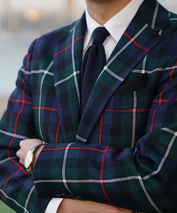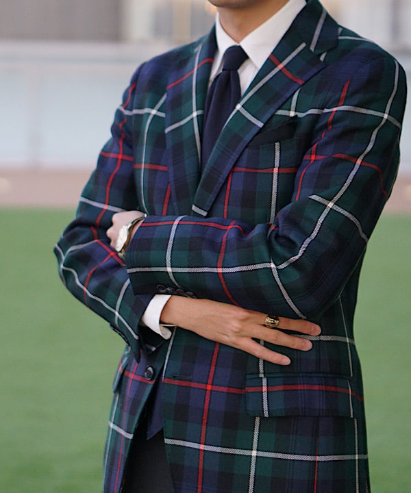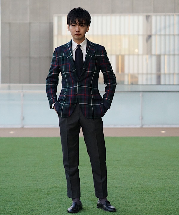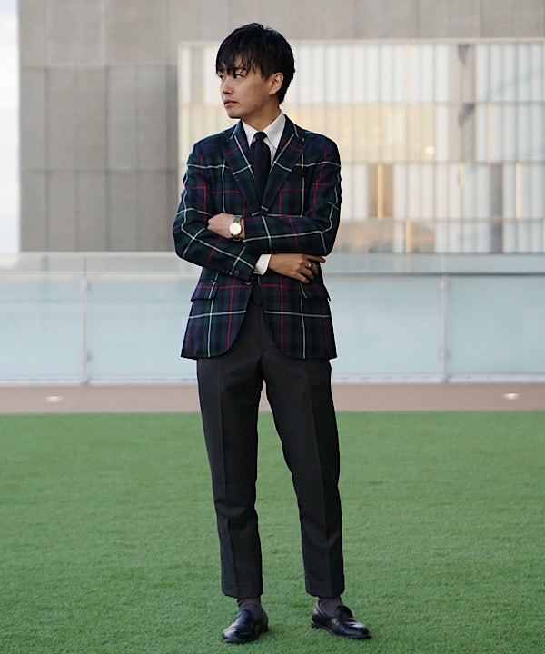 インパクトのあるタータンチェックジャケットに、白シャツソリッドタイとシンプルに。