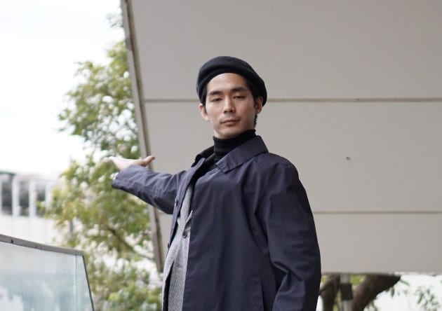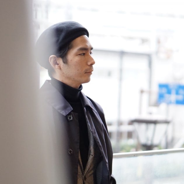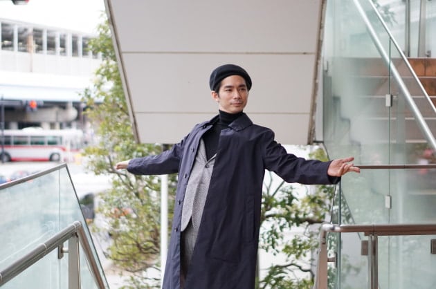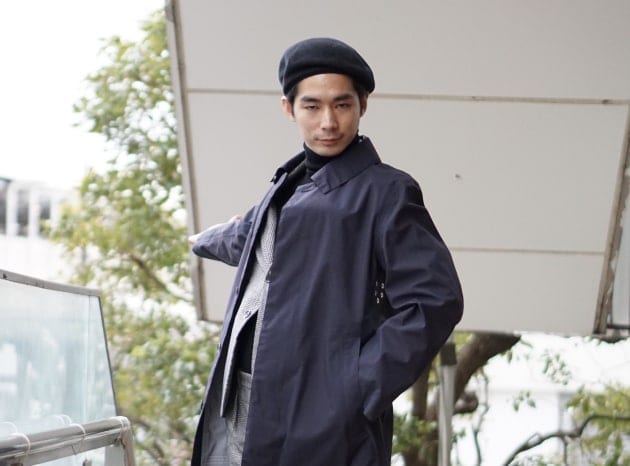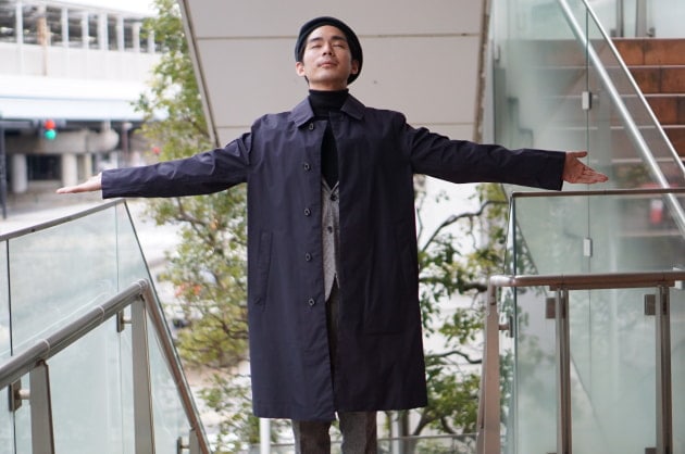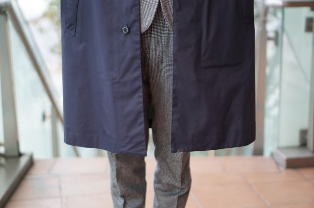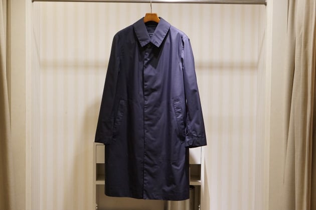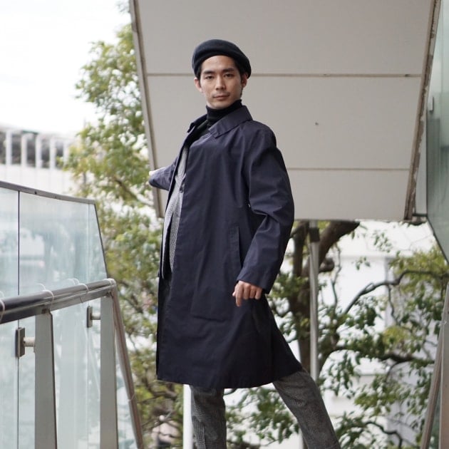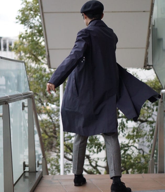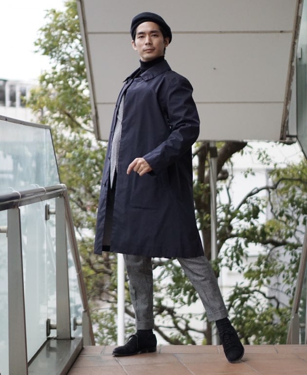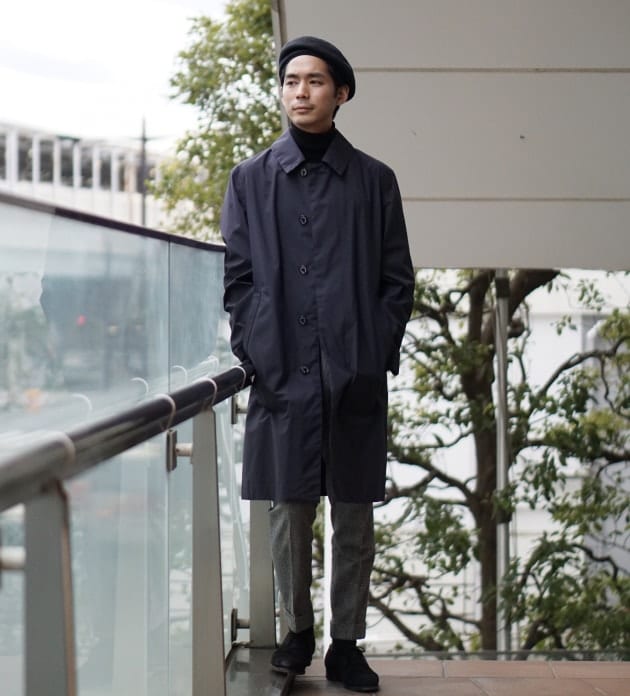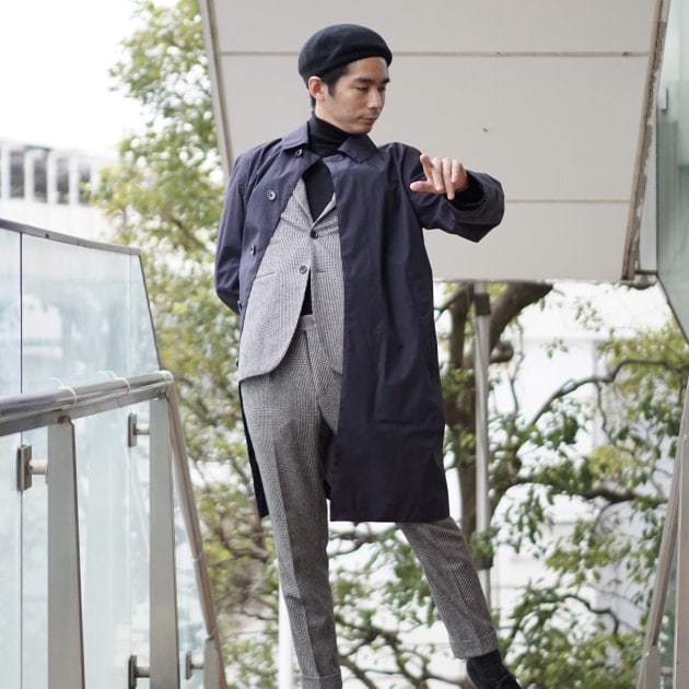 モノトーンのスーツスタイルに、濃いネイビーのステンカラーコートを合わせ、シンプルで洗練された印象に仕上げました。
