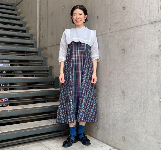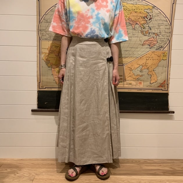 タイダイ柄のTシャツも、キルトスカートと合わせると、少し落ち着きます。