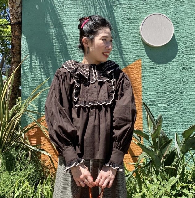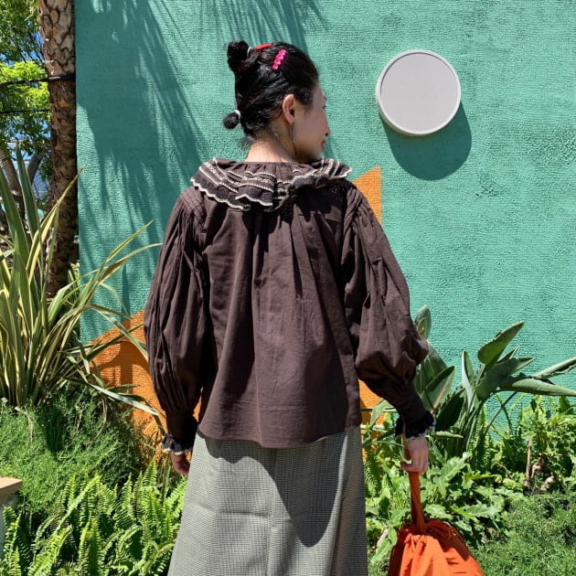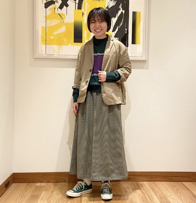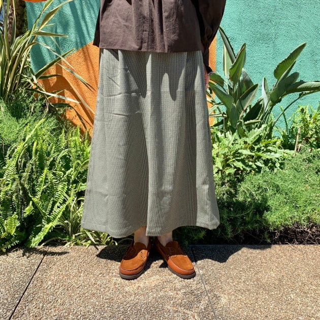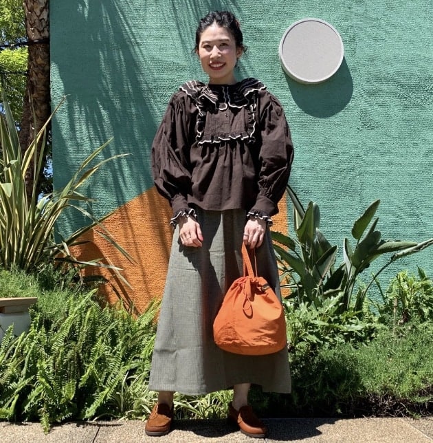 スカート丈が少し短くなるので、トップスにはボリュームのあるブラウスを合わせました。全体的にブラウン系で纏めたコックリ感が秋の先取りにお勧めです。