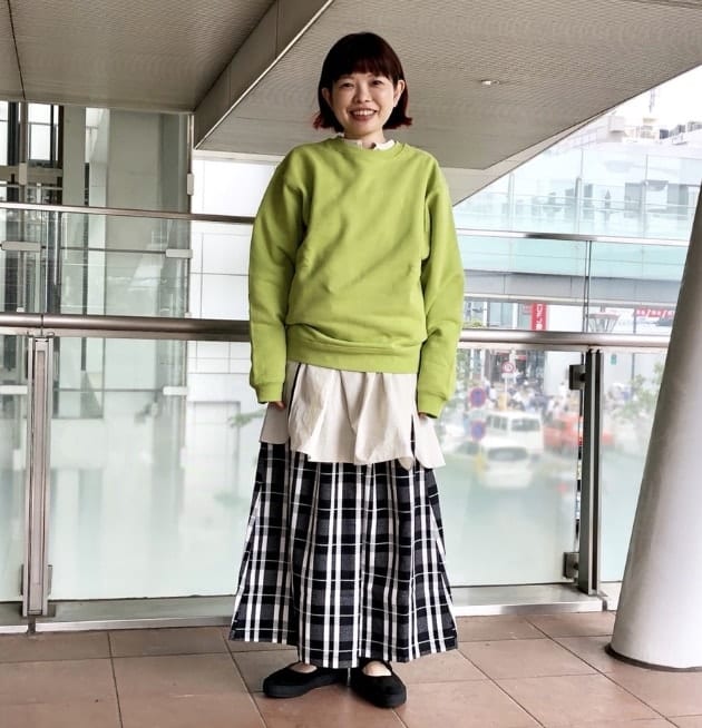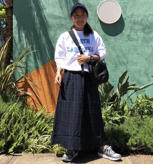 トップスに長めのシャツを合わせたスタイル。上からスウェットを着て目線を上げながら、上手くバランスを取っています!