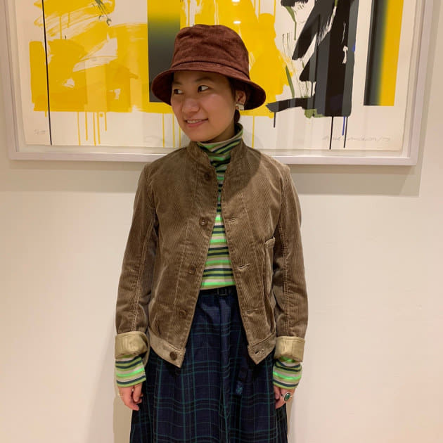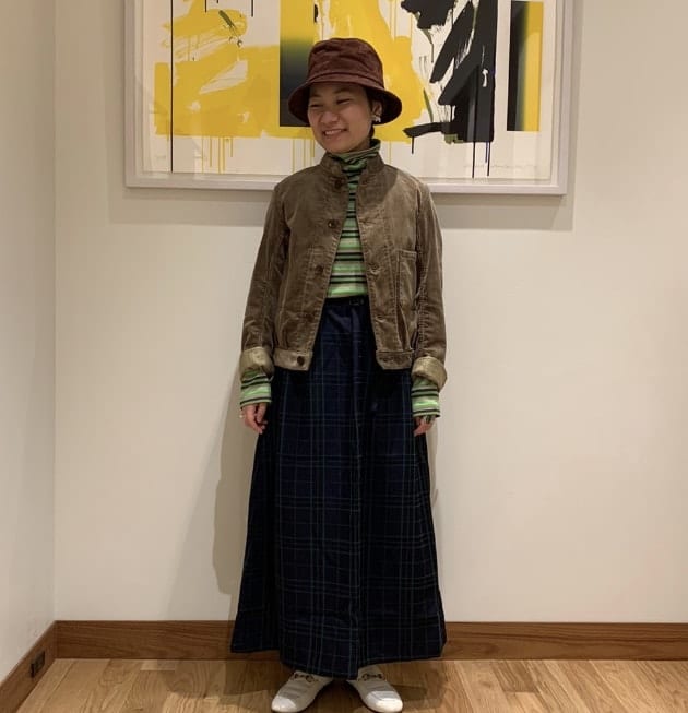 スウェードのハットとコーデュロイのバランスがダンディーなスタイルに、スカートを合わせたバランスが◎スタイリングですね〜。