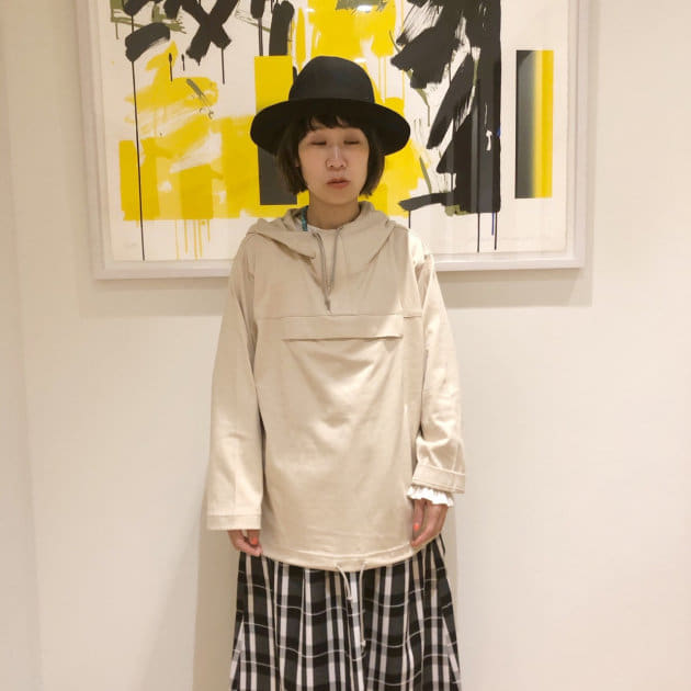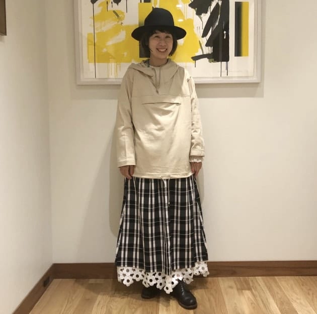 大きなポケットがポイントのハーブジップパーカーに、ハットを合わせてスカートの甘さを抑えめにコーディネート。
