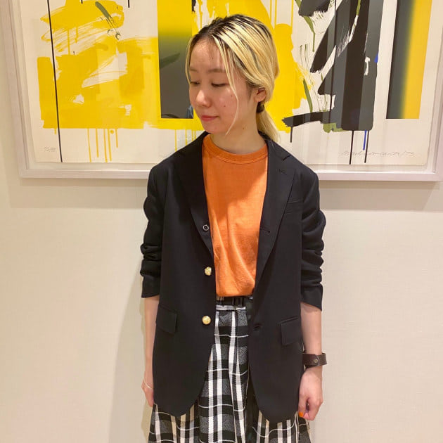 インナーにはオレンジ色のTシャツを覗かせて、顔まわりをパッと明るく!