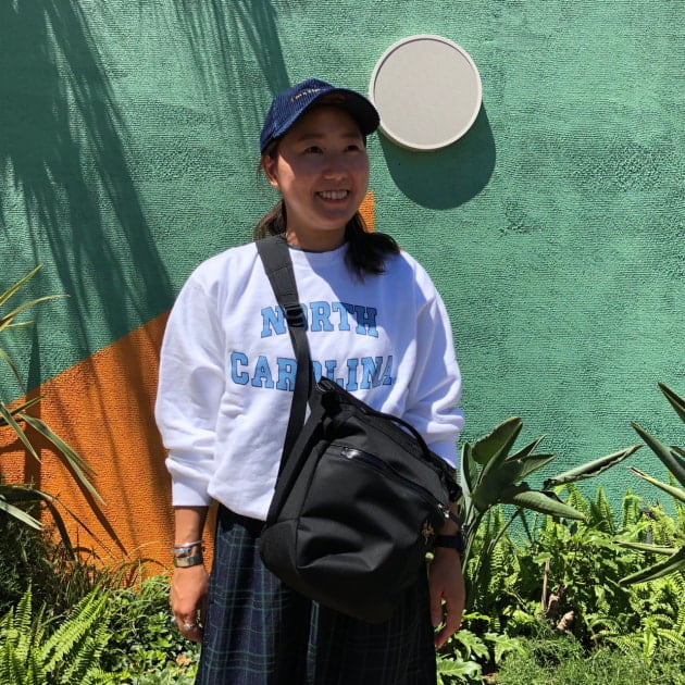 カレッジスウェットとキャップとショルダーバッグ…王道スタイルは、全て素材感を変えて、動きのあるスタイリングに。