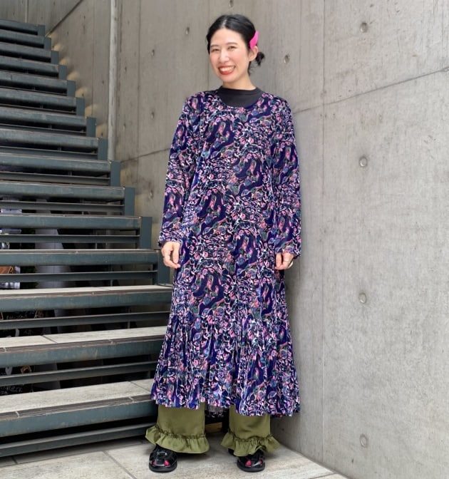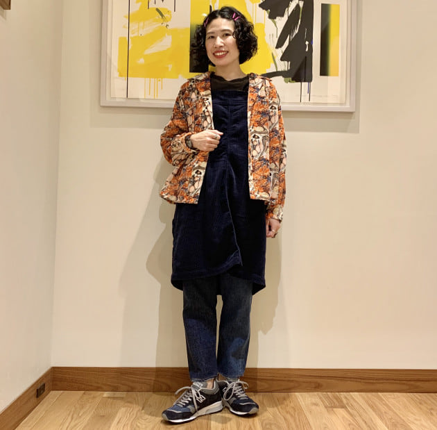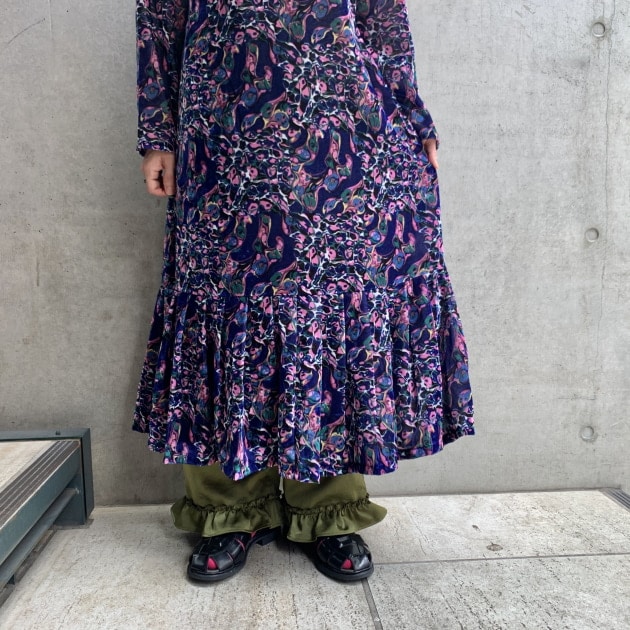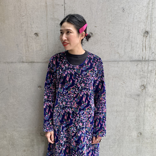 秋らしいベロア素材に、ピンクとグリーンとパープルの配色と柄が他には無い!個性的な1着。