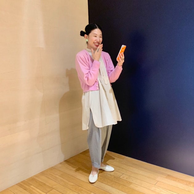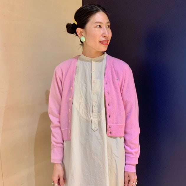 柔らかい印象になるようにピンクのカーディガンを取り入れました。