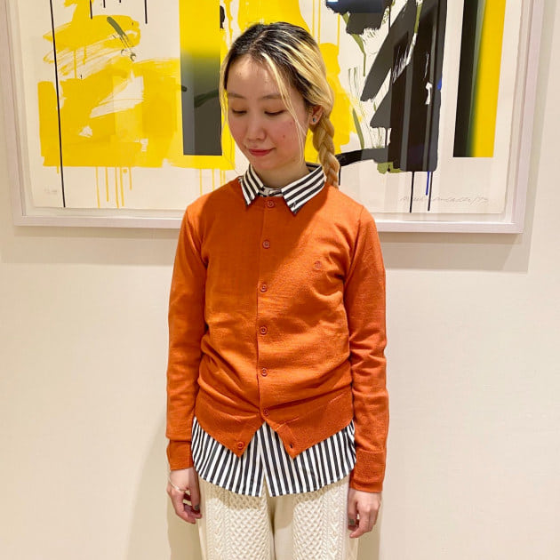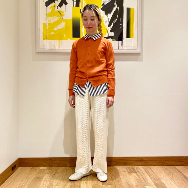白いパンツのレフ板効果といい、カーディガンのオレンジは顔色良く見えますし