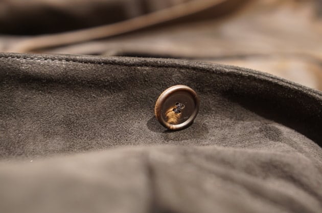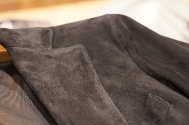 やや太めのラペル、コバのステッチ、バルカポケット。