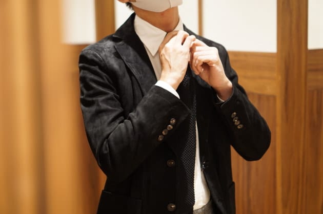 シンプルなタイドアップスタイルで、ジャケットを引き立てるコーディネートや