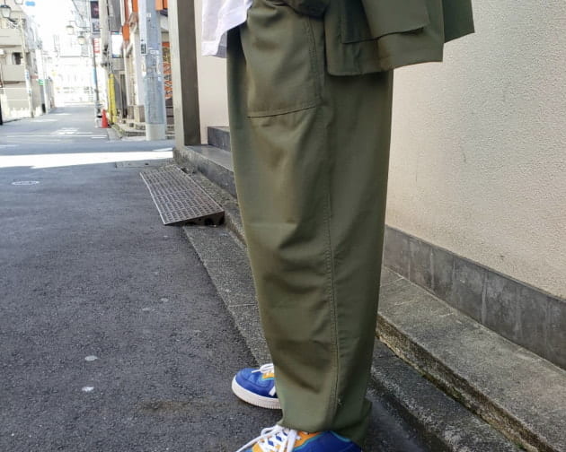 太ももと腰回りにはゆとりを持たせ、足元にテーパードもしっかり効いたシルエット。
