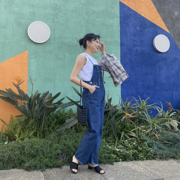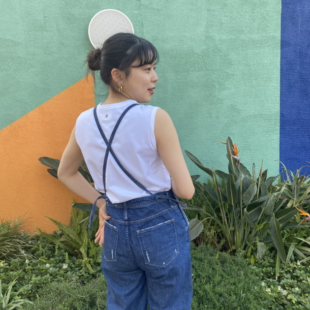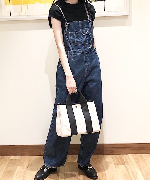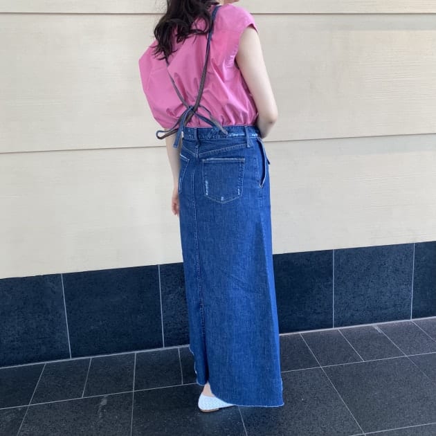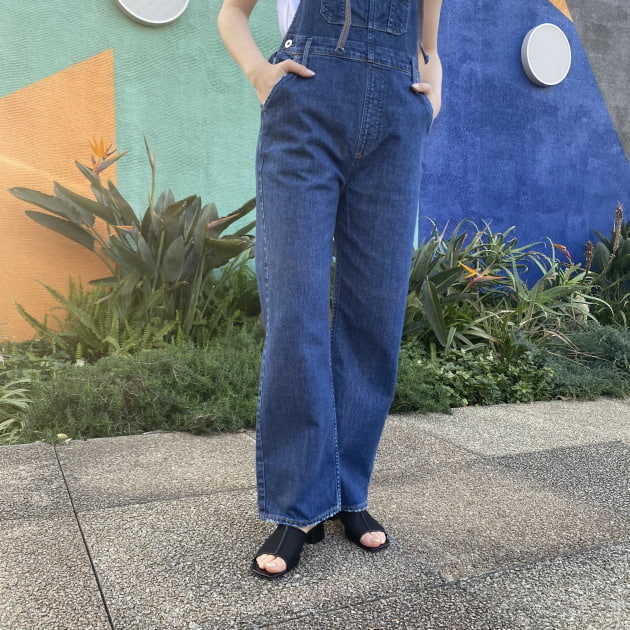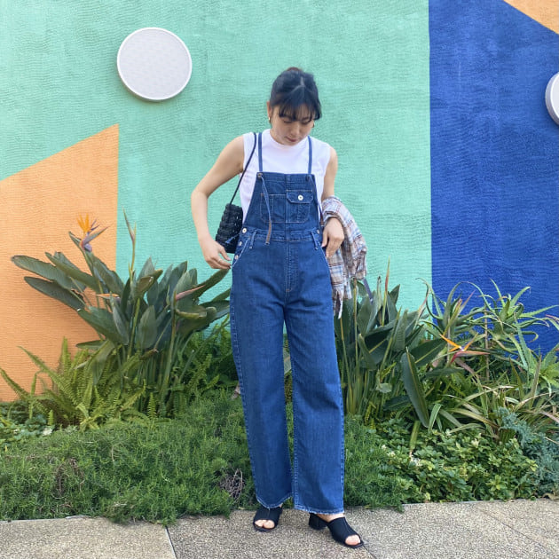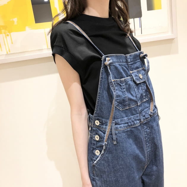 こちらは、あえてベルトの結び目を低めに設定した、大人の女性がきやすいサロペット。