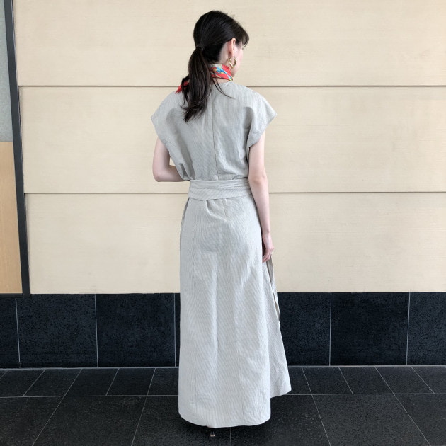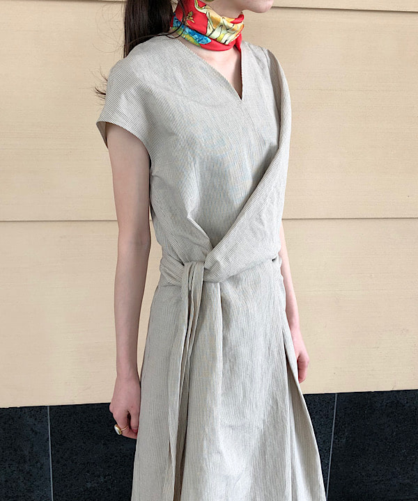ドレープのリボンはウエストをぐるりと一周しており、締め具合が調節できますよ。