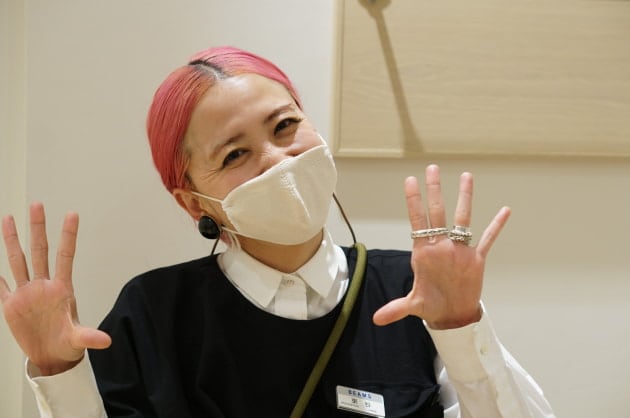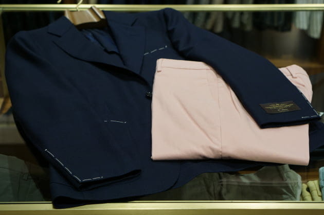 「ピンク」の中性的な雰囲気は、ジャケットのドレス感で中和。シューズ等の小物はブラウンでまとめるとバランス◎