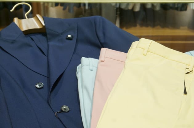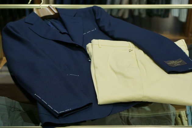 「イエロー」の淡いカラーをネイビージャケットが引き締めます。ネクタイするならブラウンをチョイスしたいです。