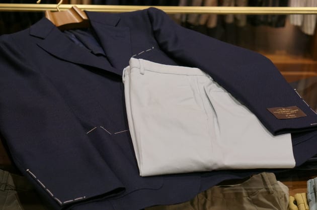 ネイビージャケットなら、トーンが明るくても相性良し。