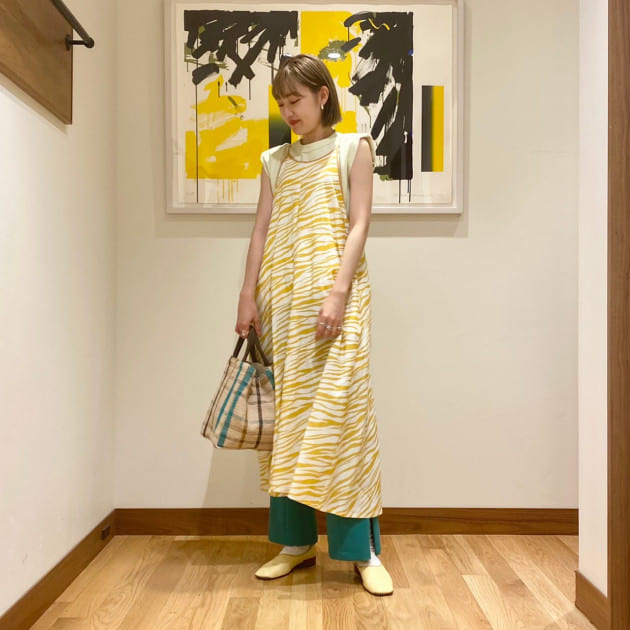 イエローのシャーリングのスカートを合わせて綺麗めスタイル◎