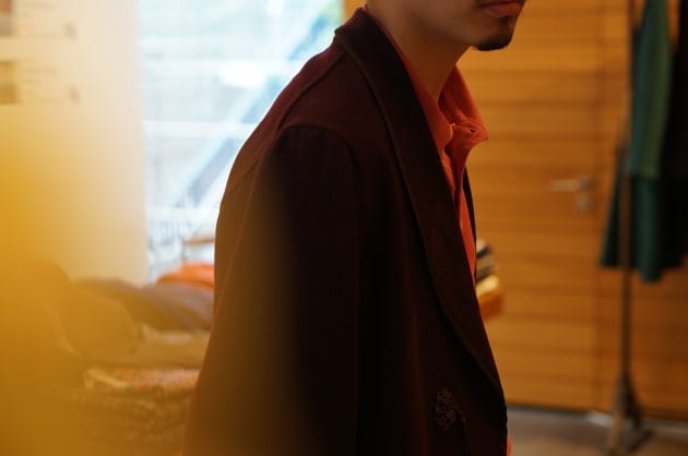 タキシードの原型とされていて、ショールカラーにターンナップカフのディテールです。