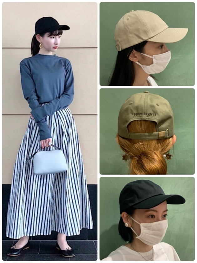このキャップ、カジュアルスタイルはもちろん、女性らしいアイテムやヘアスタイルと相性抜群なんです。