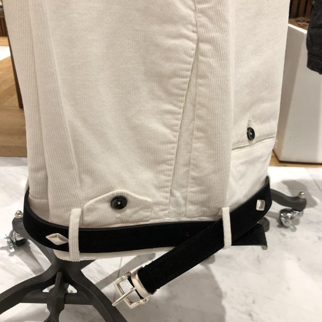 ワンプリーツ、コインポケットとクラシカルな趣き。