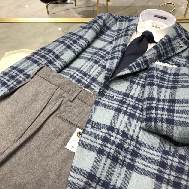 白シャツ×ネイビーソリッドタイ×グレーウールパンツの王道合わせですが、ジャケットがコーディネートを一気に格上げしてくれます。