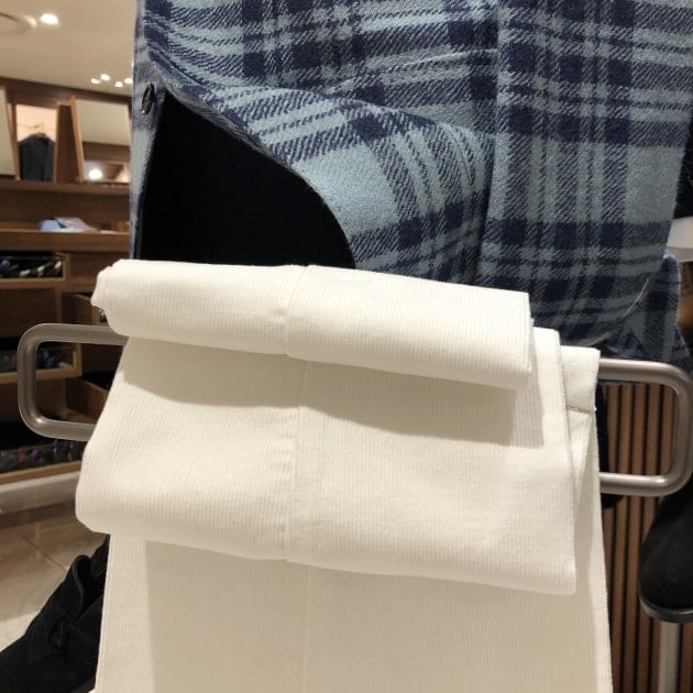 パンツは万能ホワイト。コーデュロイでジャケットとの素材のバランスをとって。