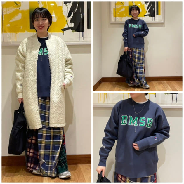 「ネイビーカラーでシンプルなので柄スカートを合わせました。裾リブが締まっていなくて本当に楽に着られる〜〜。色の散らかり抑えてくれるChampionボアコートも最高です!!」