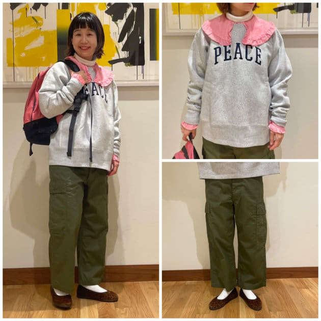 スウェットにカーゴパンツの定番合わせにフリルシャツやレオパード柄のシューズでアクセントをつけました。」