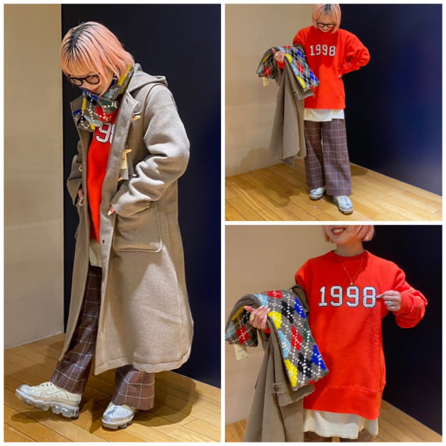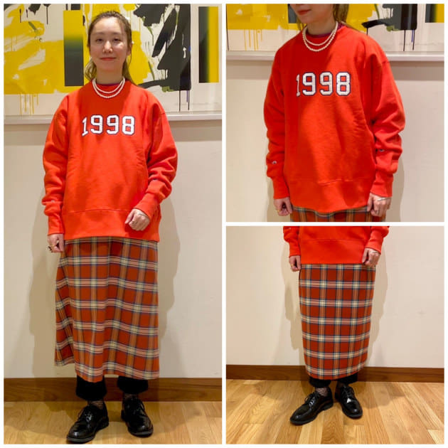 「実は私1998年生まれでして、このスウェットには並々ならぬ思い入れがございます♪ビビットなオレンジのスウェットにはインナーの裾をチラ見せして色を区切り、暖色系の落ち着いた色味のチェックパンツを合わせました。」