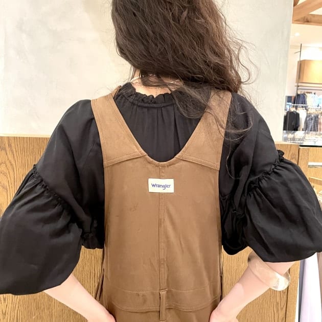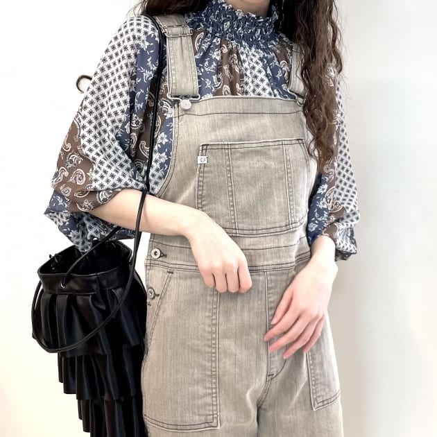 細身のオーバーオールに、ボリューム袖が可愛すぎます。カジュアルになりすぎないシルエットなので、ブラウス合わせもオススメ◎