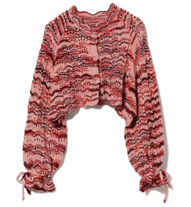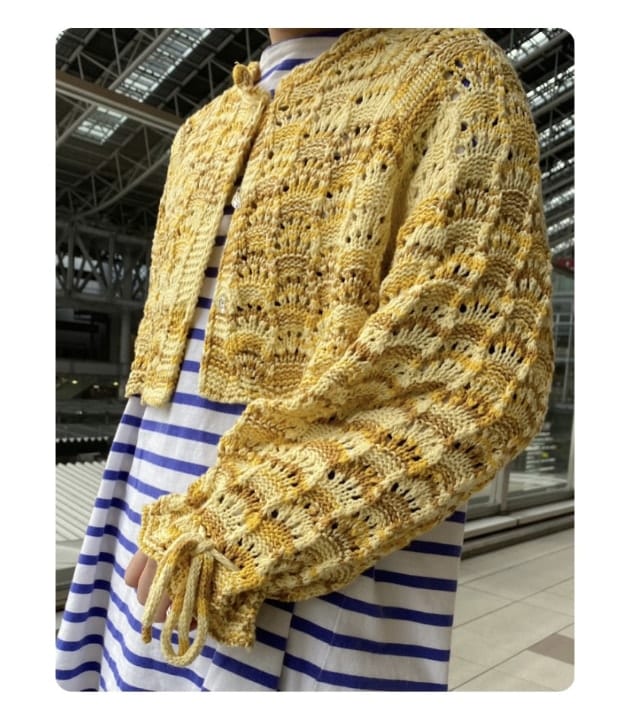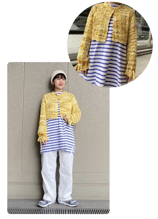 こちらのカーディガンもコットンの糸をかすり染めにしており、たくさんのカラーがミックスされてます!