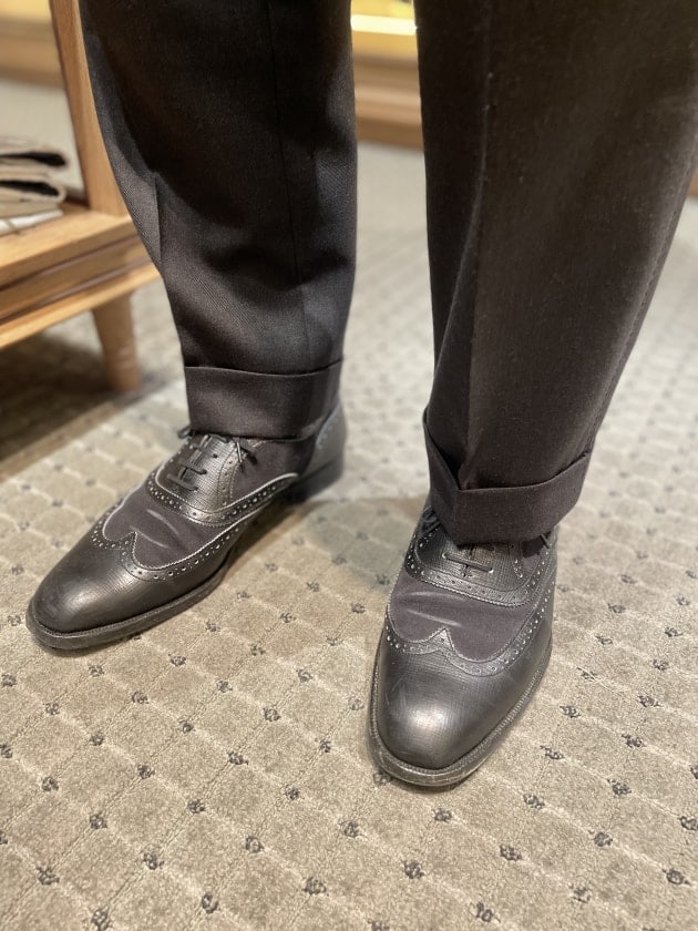 足元は珍しいブラックスエードコンビのフルブローグ。足元をブラウンではなくVゾーンとの調和と気分でブラックにされているところがスタイリングのポイント。