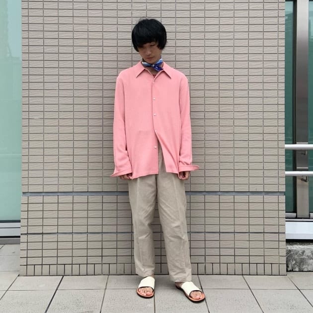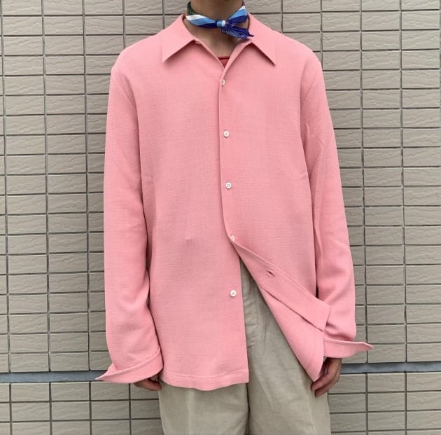 少し小襟のこちらは、先ほどのピンクのシャツみたいに開襟シャツの様に着るのではなくて第3ボタンまで開けてダイナミックにスタイリングしたくなります。
