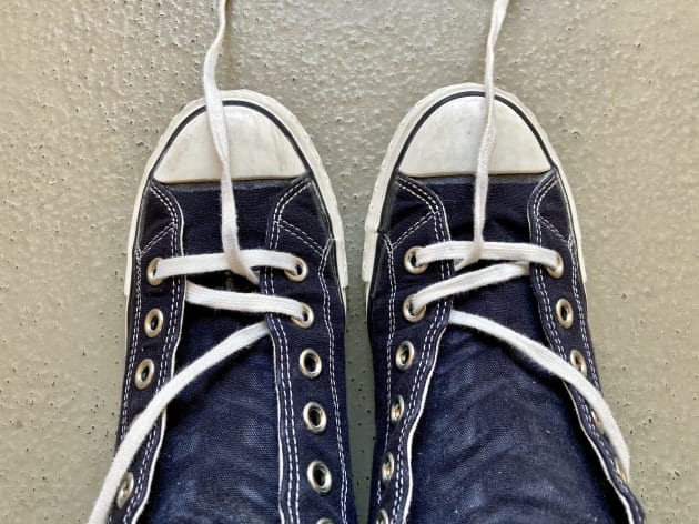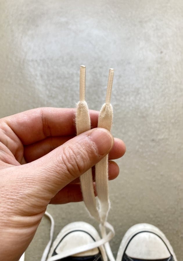 ③左右の靴の外側のシューレースをホールの上から下に通します。