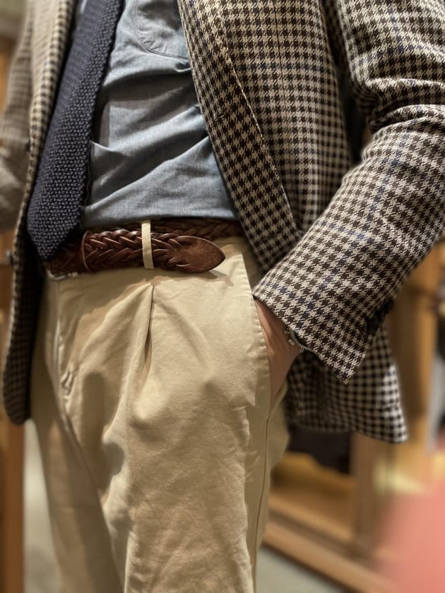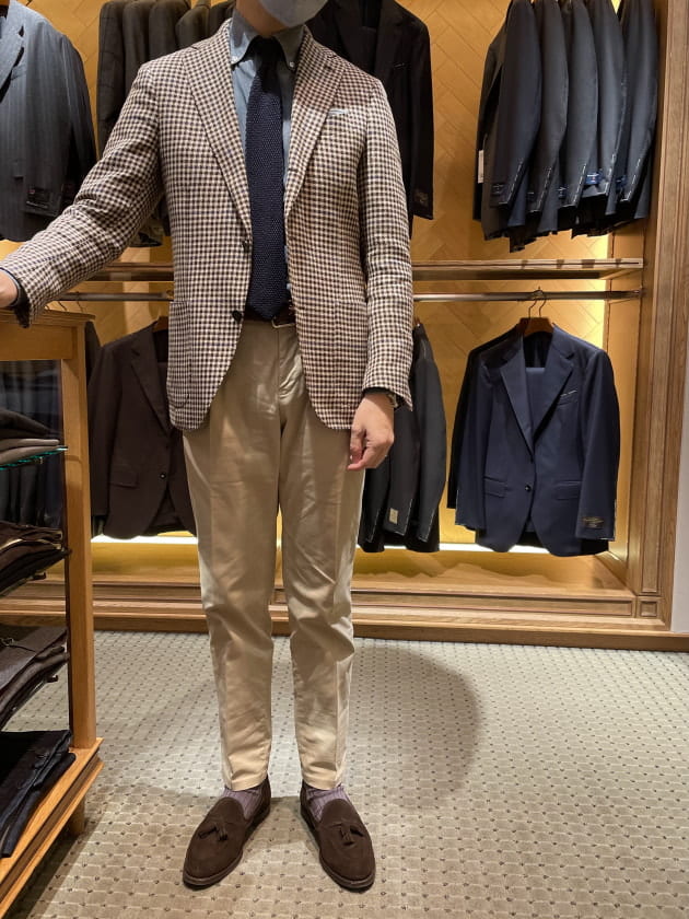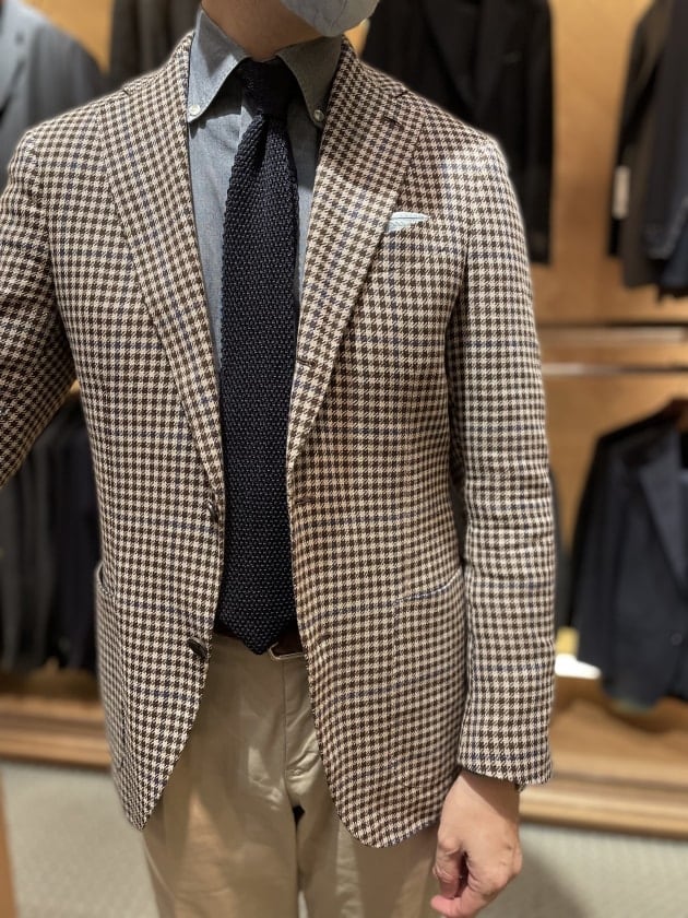 以前にお求めの〈LARDINI(ラルディーニ)〉のチェックジャケットのインナーには初期のBEAMS Fのシャンブレー ボタンダウンシャツにネイビーのニットタイ。ポケットスクエアは懐かしいBEAMS Fのシャンブレー。