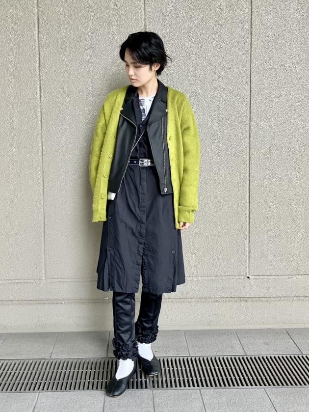 こちらはメンズのアイテム。Mサイズをライダースの上にアウターとして羽織ってみました。天邪鬼具合が光っていますね。
