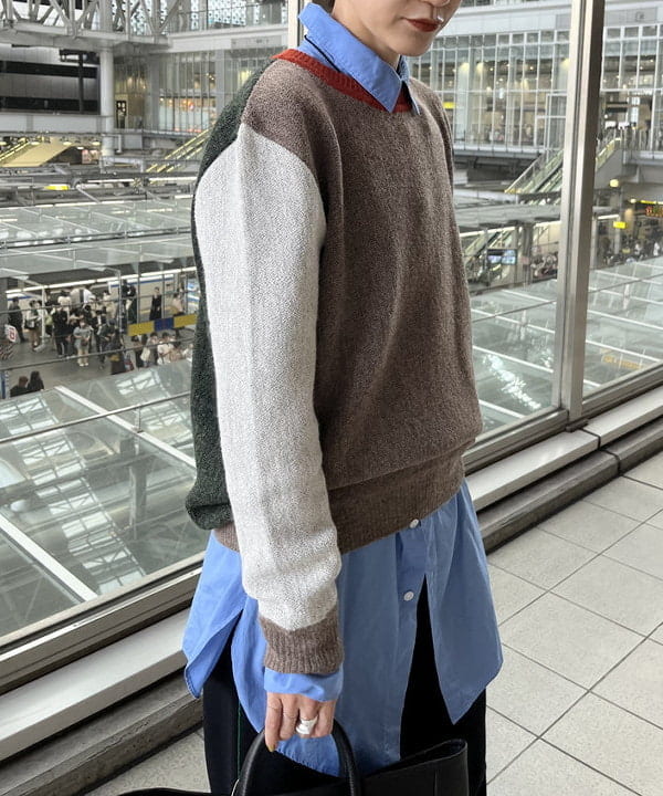 この日の中本はマルチなカラーリングのニットにロングシャツをレイヤードした内長外短のバランスでコーディネート。