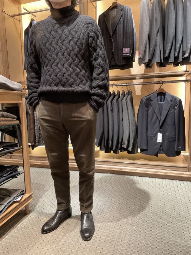 コートをお脱ぎいただくとローゲージのタートルネックケーブルニット。
