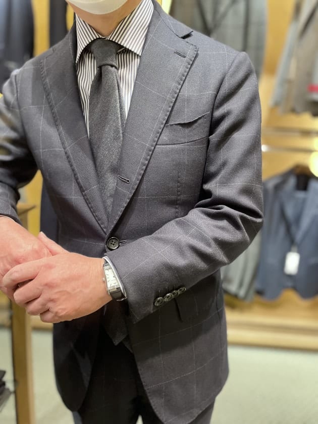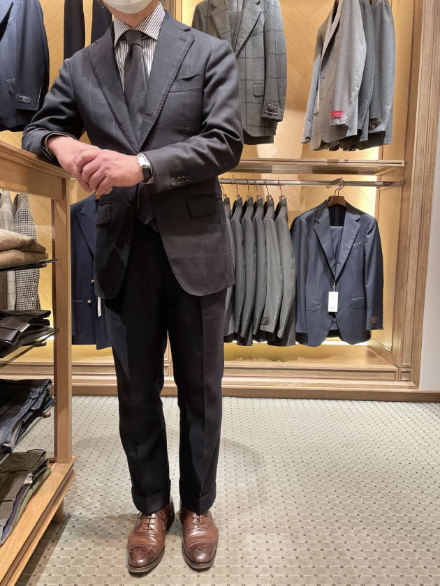 以前にお求めのBrilla per il gustoのウィンドーペーンのネイビースーツをベースにしたスタイリング。