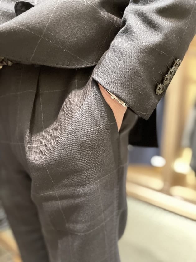 トラウザーズは1アウトプリーツ。