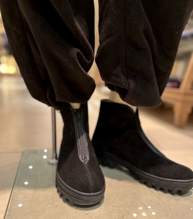ボリューミーなパンツによく合うごつめソールのブーツ。フロントジップなのが良いですよね。