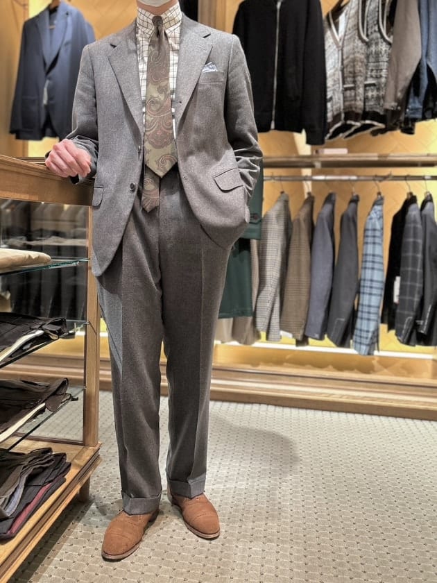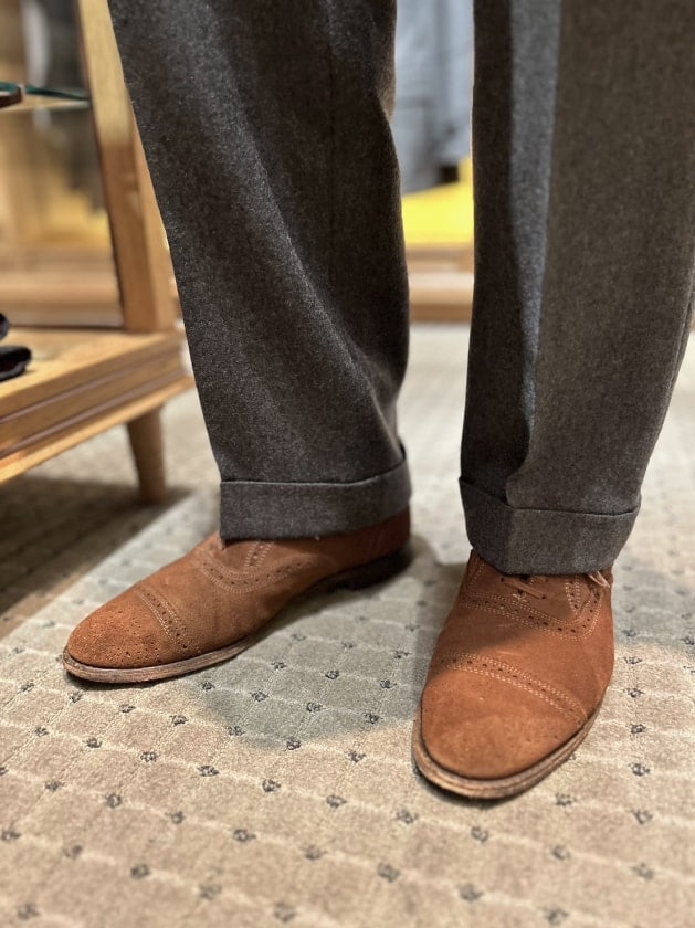 そして足元も抜かりなくタバコスエードのセミブローグシューズ。