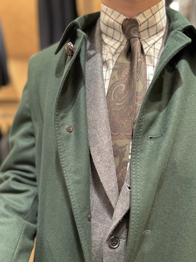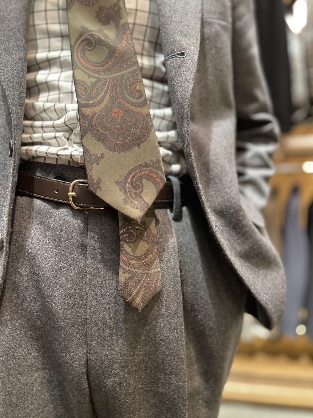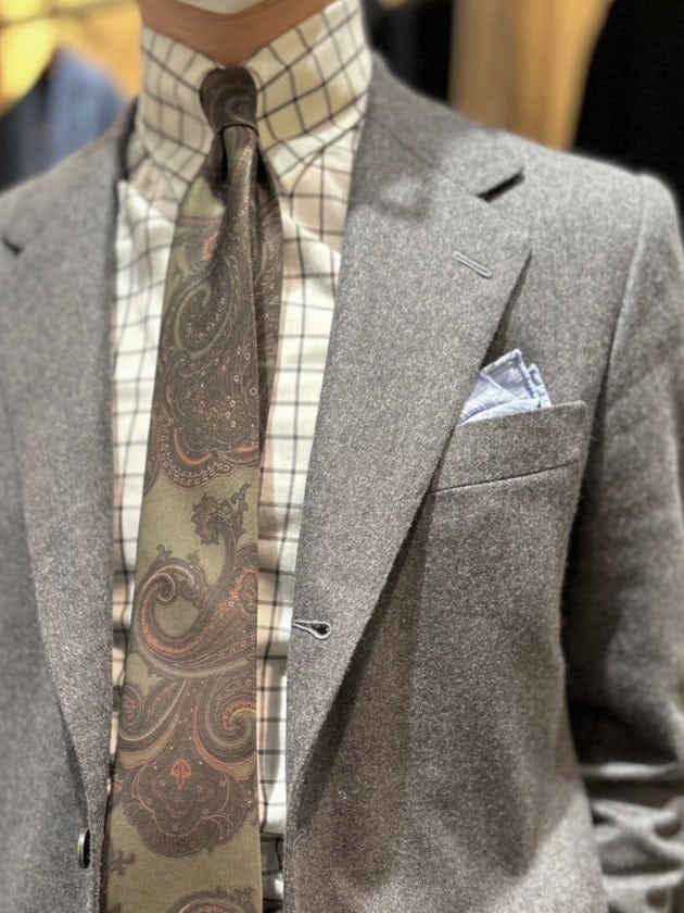 そのスーツのインナーには BEAMS Fのタッタソールタブカラーシャツと〈FRANCO BASSI(フランコ バッシ)〉のペイズリープリントタイ。スポーティーかつ柔らかい雰囲気でスーツとの相性よし。